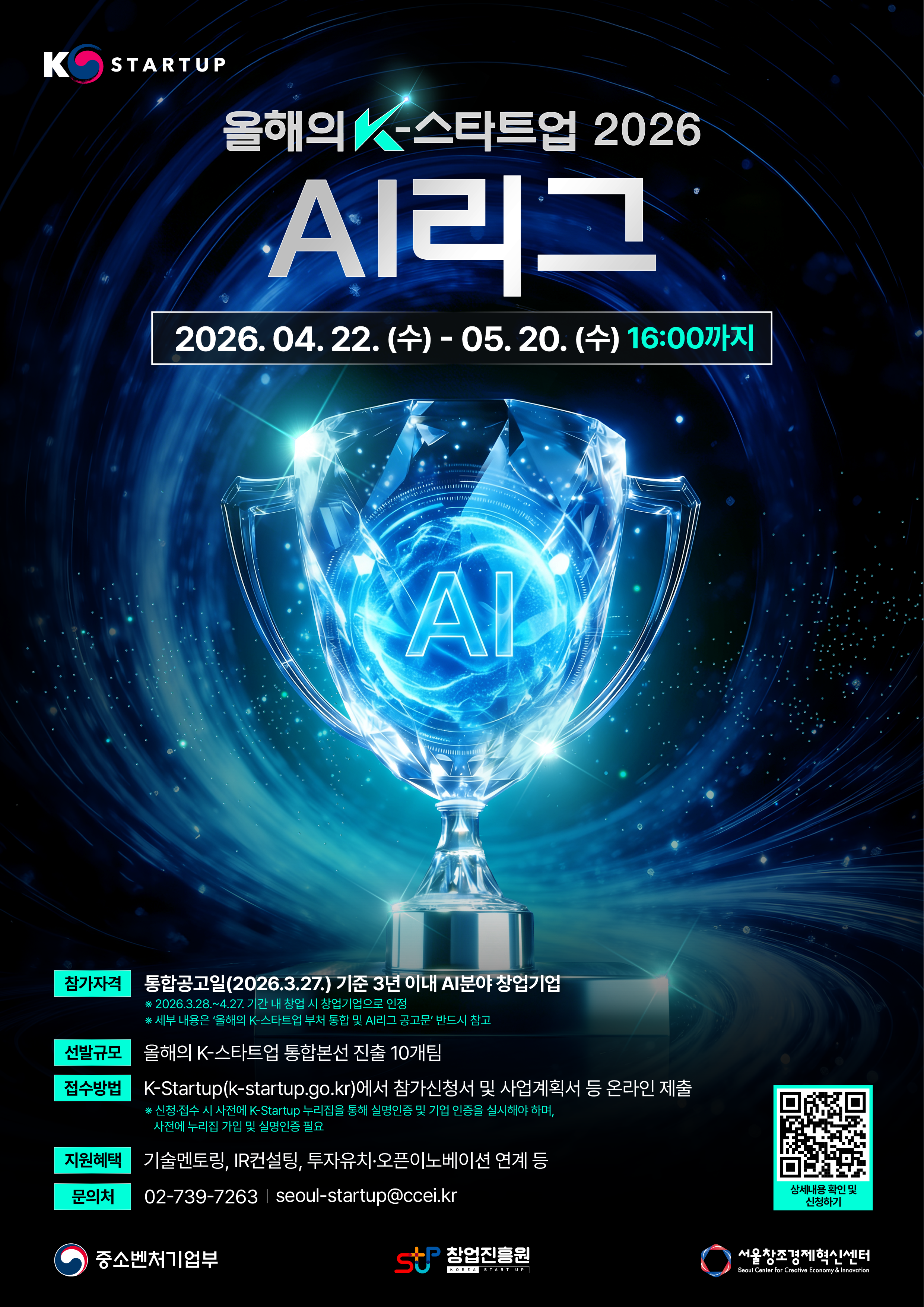 - (목적) 『올해의 K-스타트업 2026』 창업경진대회 예선리그를 통해 우수한 창업아이템을 보유한 유망 창업자를 발굴 및 포상하여 창업 분위기 확산