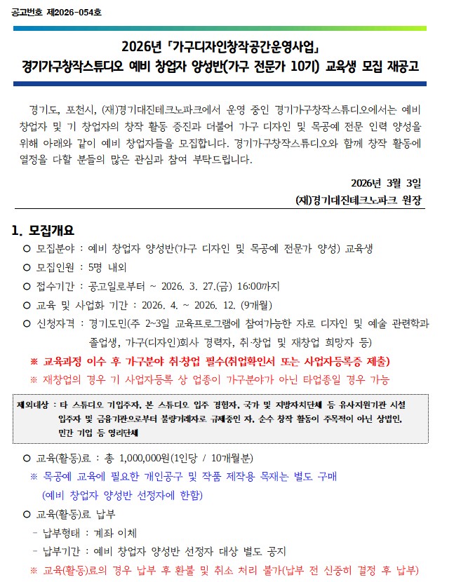 신청대상 : 경기도민(주 2~3일 교육프로그램에 참여가능한 자로 디자인 및 예술 관련학과 졸업생, 가구(디자인)회사 경력자, 취·창업 및 재창업 희망자 등)