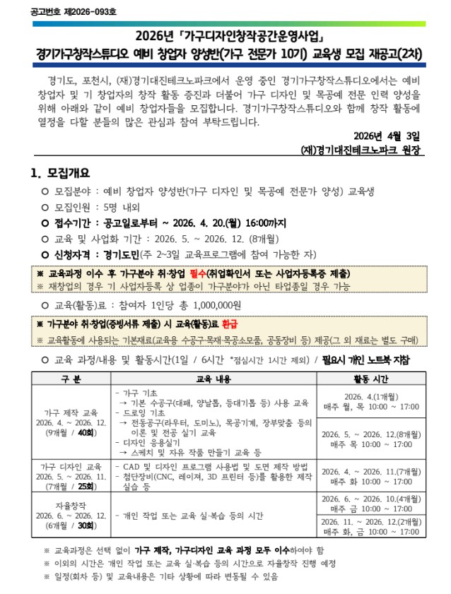 - 교육(활동)료: 총 100만원(1인당)이며 가구분야 취창업(증빙서류 제출) 시 환급
