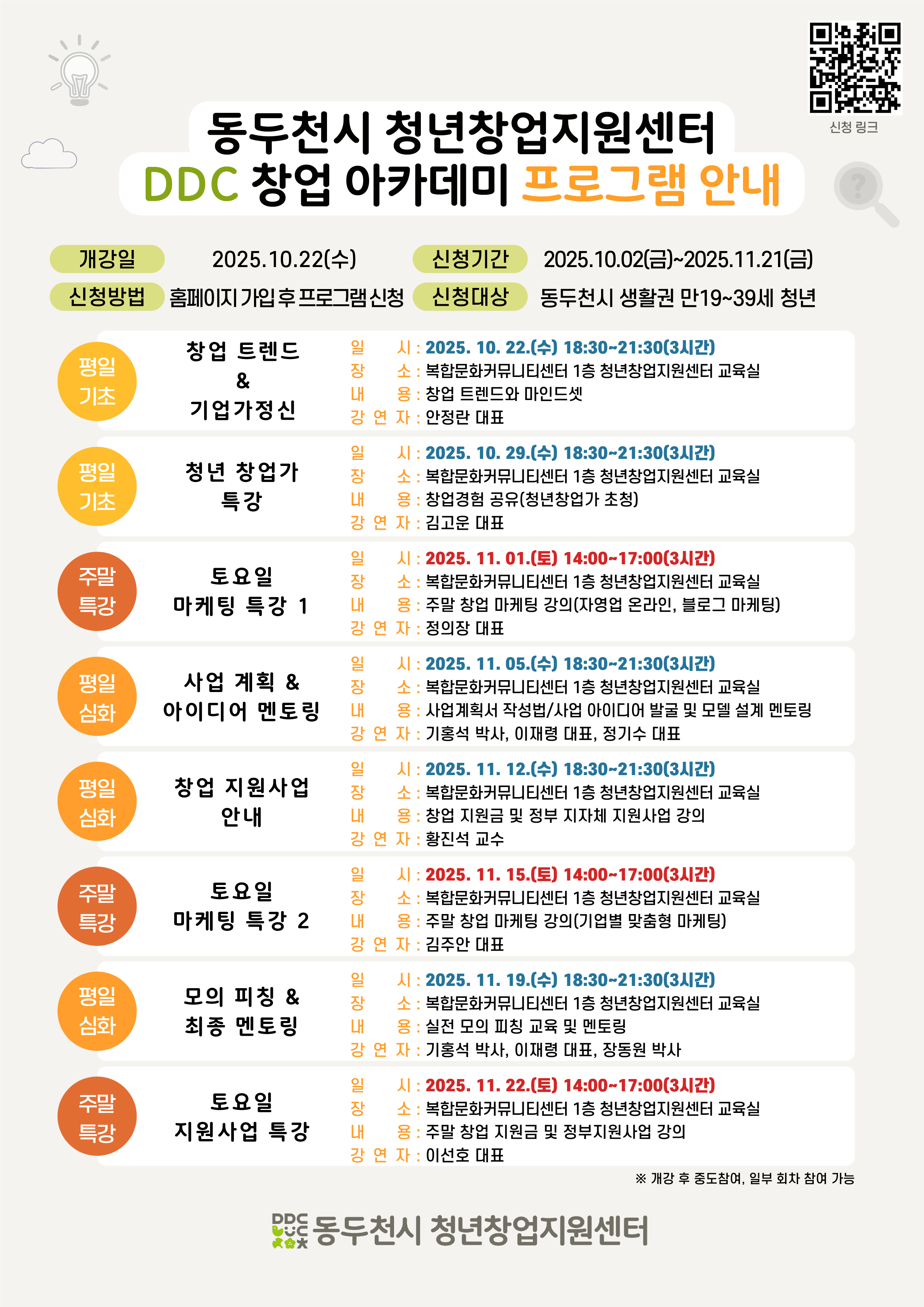 신청 : 홈페이지 가입 후 https://www.ddcstartup.co.kr/program/index.php?pmode=view&idx=53 링크에서 신청