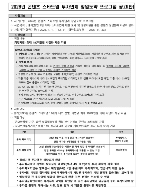 - 공고 마감일 기준, 법인 설립일로부터 창업 7년 이하의 콘텐츠 스타트업 기업